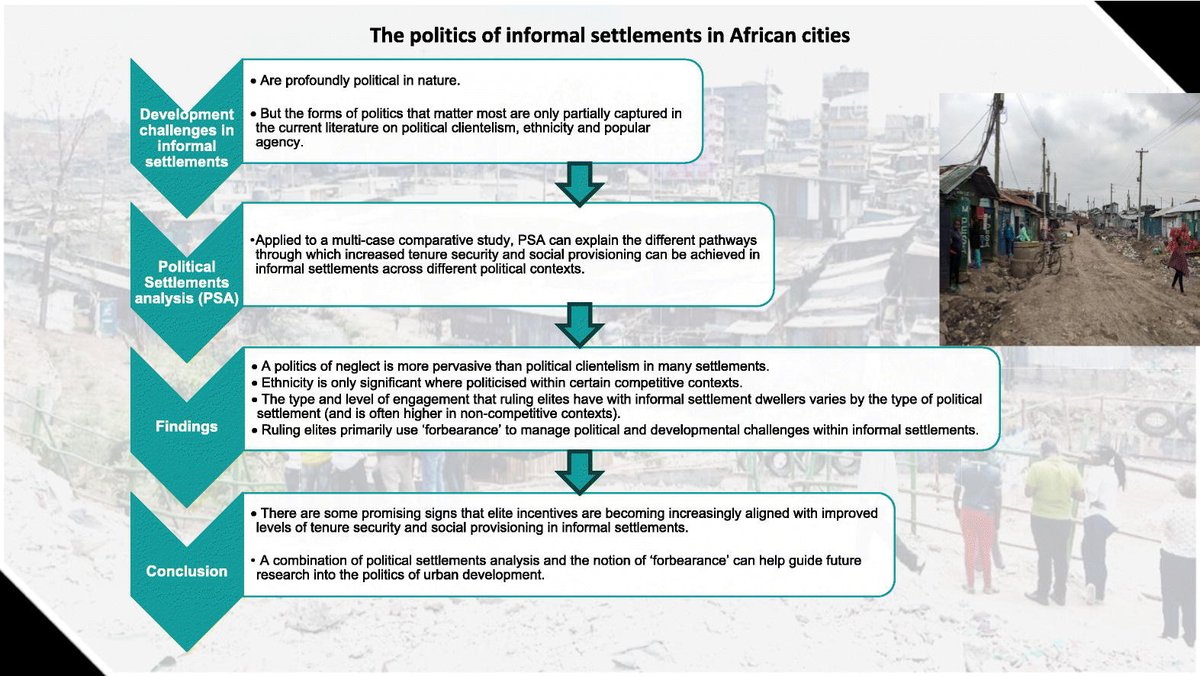 The paper explores how political settlements analysis can help explain tenure security, social provisioning, and governance in informal settlements – highlighting how entrenched interests, patronage politics, and varying national contexts influence outcomes for low-income urban residents. It also challenges common assumptions about clientelism and ethnicity, offering a more nuanced lens on the political economy of African cities.