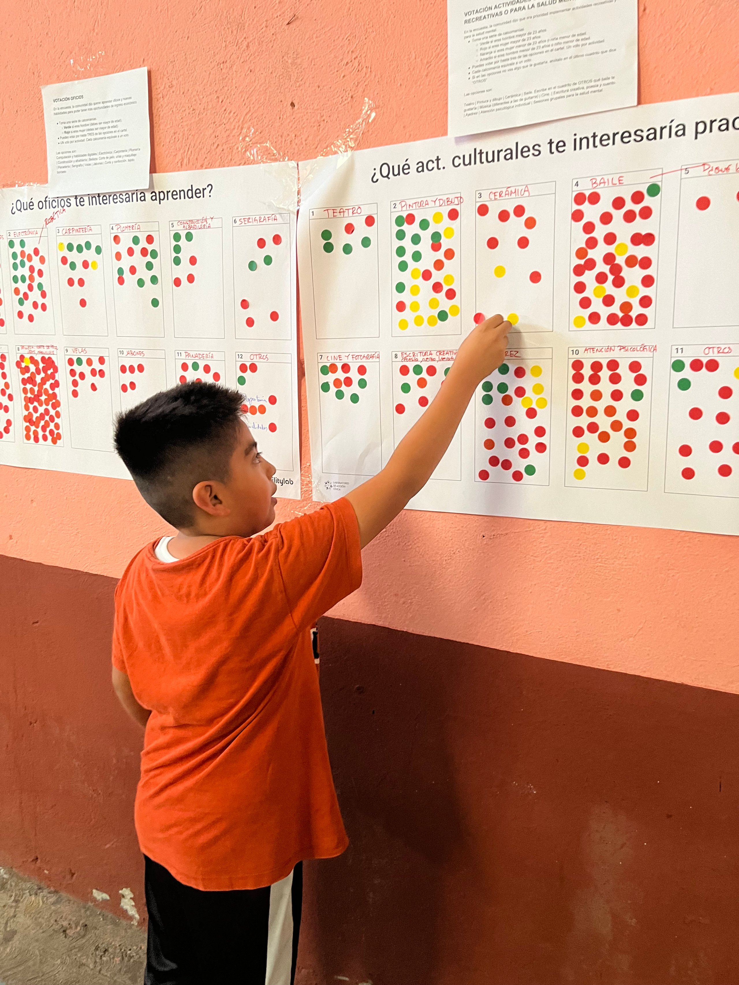 Así, nos aliamos con Mixtura, un colectivo de expertxs en diseño y visualización de datos, con abordajes participativos y una perspectiva comunitaria. Con ellxs, realizamos un taller con lxs coordinadores de comités y cuadras para imaginar en conjunto un proceso participativo que, posteriormente, involucraría al resto de la comunidad. Diseñamos carteles con los hallazgos clave y los colocamos en once puntos estratégicos del predio: la tortillería, la panadería, la lechería, la escuela de música, y más. Los mismos carteles circularon por Whatsapp. Y en la Asamblea General de ese mes, implementamos el proceso codiseñado con lxs coordinadores, logrando que la comunidad habitara los resultados. Se realizaron mapeos colectivos para señalar en qué calles faltaban luminarias y dónde se acumulaba la basura. Hubo votaciones para decidir qué actividades deportivas, culturales y de oficios querían ver implementadas. Los datos volvieron a manos de quienes los habían generado.