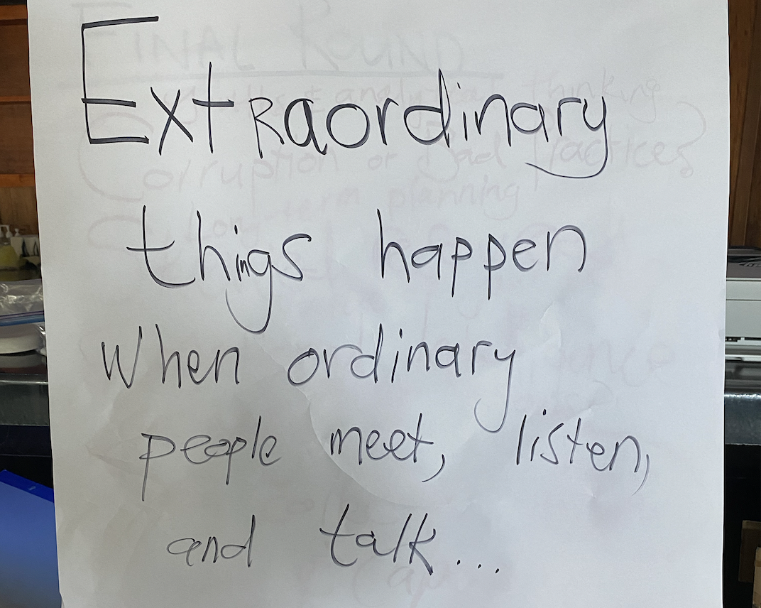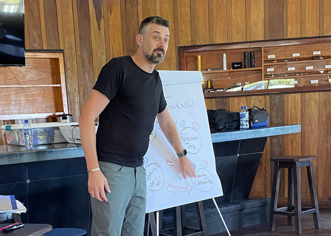 On the second day, the group participated in a World Café session focused on good governance. They engaged in small-group discussions and rotations, which encouraged sharing of ideas and innovative problem-solving. In addition, they participated in a network weaving exercise using colored wool to visually demonstrate networking. This exercise led to conversations about intentionality, support, and maintaining morale. Jaco explained, “While networking can be uncomfortable and awkward, the power of networking is almost limitless and has a snowball effect. We all need other people, and sometimes we lack the confidence to create resources.” On the third day, the training focused on ensuring the sustainability of initiatives beyond the project period by strengthening connections and relationships and emphasizing ongoing support and feedback mechanisms.